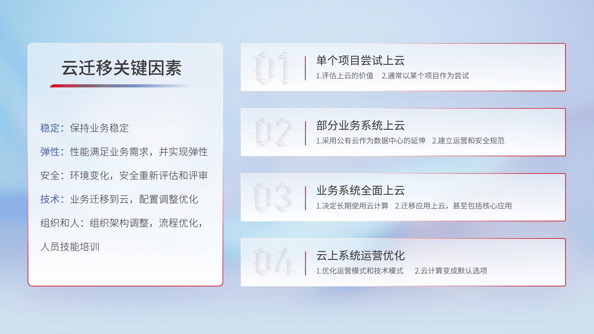 结合实际业务,,,,从规划设计、、云平台选型、、、云原生改造、、、数据迁移、、、集成交付,,,,迁移全过程为客户识别最佳上云路径,,做好风险识别管理,,,,设计网络架构、、、身份权限、、、、安全审计合规、、、、操作审计、、、、日志审计、、、监控告警策略、、、多站点容灾设计等,,,,对云上基础设施进行整体规划,,,提升IT治理水平,,,,以满足弹性、、高可用、、、高性能的需求。。