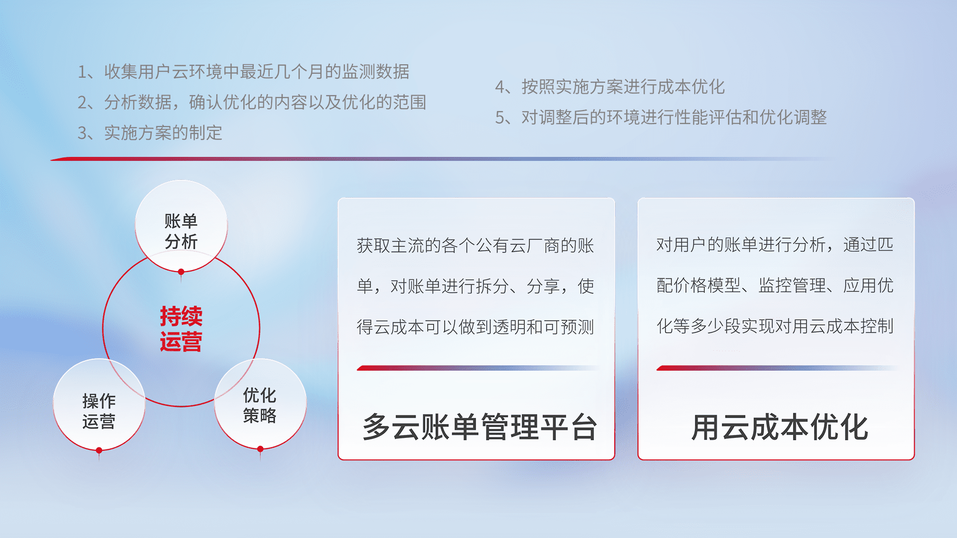 通过多云纳管,,,,以统一的资源数据模型把客户的云资源进行抽象和封装,,进而实现对多云资源的统一操作,,保障云资源管理的可靠性、、、稳定性与可用性。。。。量身定制化运维内容,,,配置、、、开发运维、、、补丁管理、、备份、、监控、、认证和访问管理、、审计和日常巡检等,,,,保障在用云过程中的可靠度,,,,稳定度以及高可用率。。。。