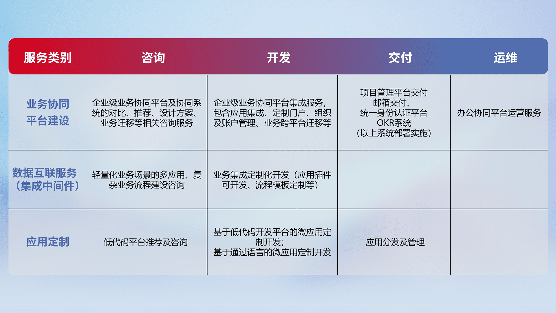 针对钉钉、、、企微、、、、IDaas等平台级产品提供产品的规划、、、方案、、交付、、定制化开发等服务,,实现如统一协同办公、、智能客户服务、、、、混合会议管理、、、、智能数据查询、、、等业务场景,,,实现数字化转型。。